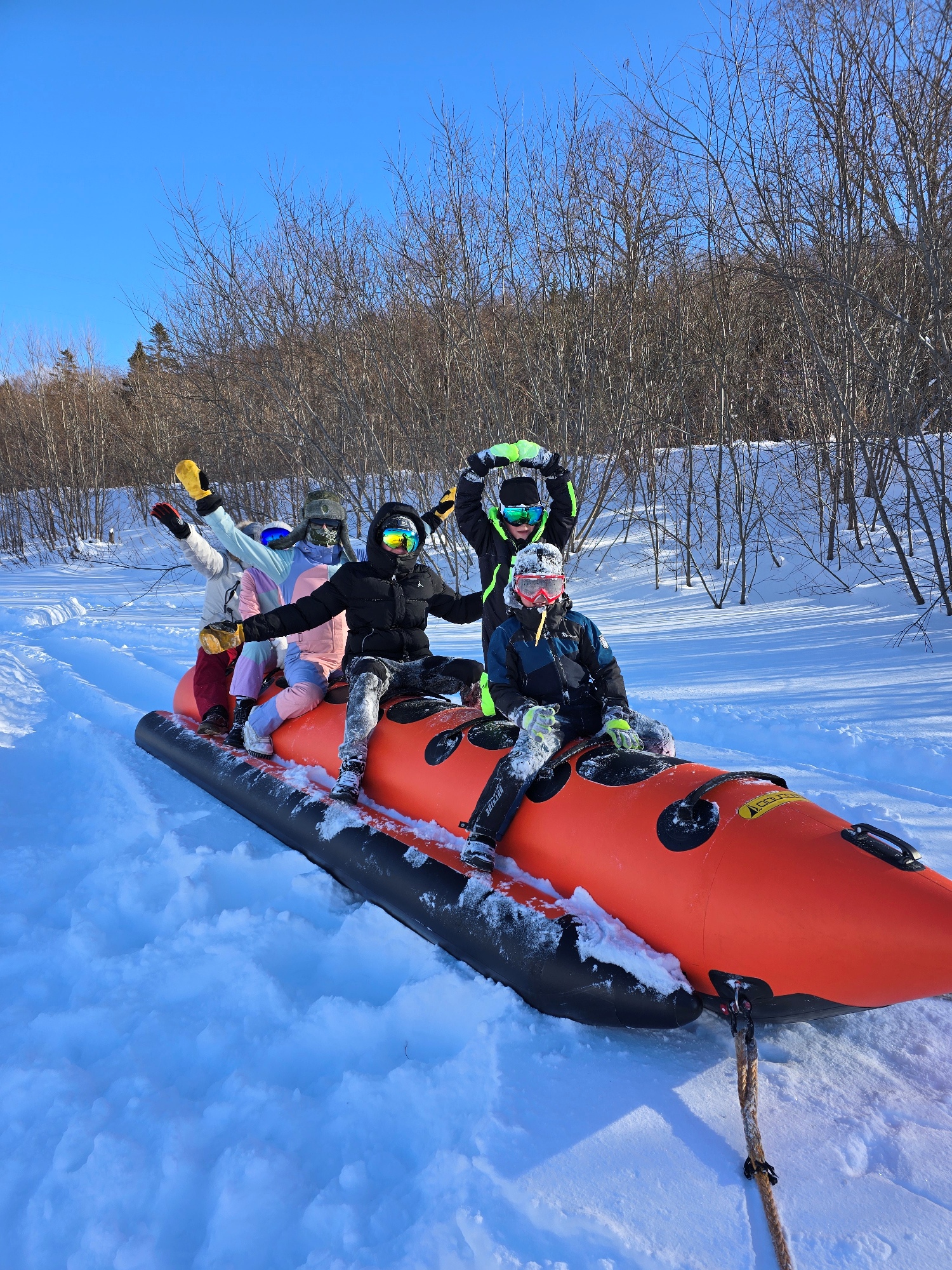 Зимний банан — суровая и более динамичная версия летнего аттракциона. Вместо катера — снегоход, вместо волн — крутые сугробы и виражи.