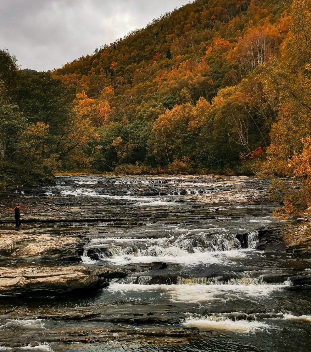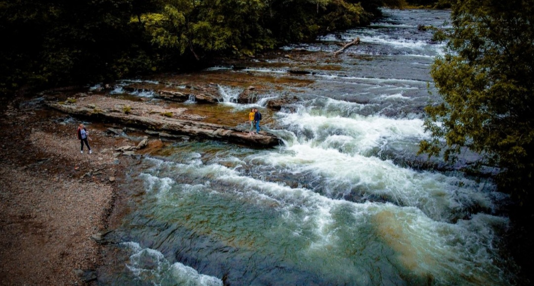 Зрелищный каскад: Вода падает с нескольких ступеней, образуя густую белую пену и мощный гул, который слышно задолго до появления порогов.